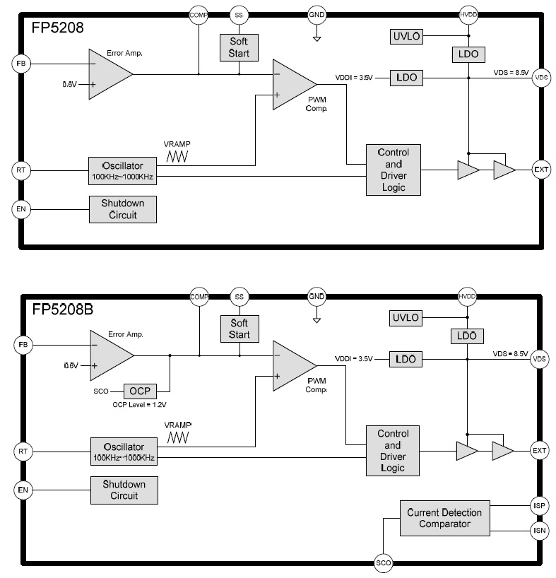 FP5208 與FP5208B 是非同步升壓控制IC,透過EXT Pin 控制外部NMOS,輸入低啟動(dòng)電壓2.5V 與寬工作電壓4.5V~24V,單節(jié)鋰電池3V~4.2V 應(yīng)用,將Vout 接到HVDD Pin;精準(zhǔn)的反饋電壓0.6V,軟啟動(dòng)時(shí)間由外部電容調(diào)整,工作頻率由外部電阻調(diào)整,F(xiàn)P5208B 有電流偵測與保護(hù)功能,外部不需要再加運(yùn)放做檢測。