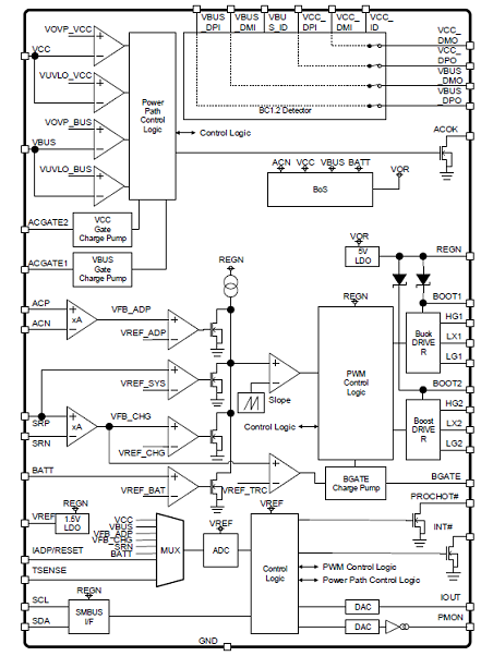 BD99954 includes a Battery Charger, two port BC1.2 detection, a Battery Monitor for voltage, current, temperature andalarm(INT#, PROCHOT#) Controller.
