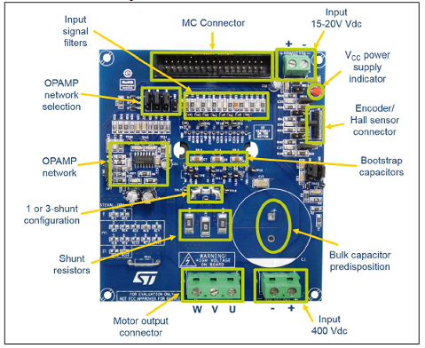 The main characteristics of this evaluation board are small size, minimal BOM and high efficiency. It consists of an interface circuit (BUS and VCC connectors), bootstrap capacitors, snubber capacitor, hardware short-circuit protection, fault event and temperature monitoring. In order to increase the flexibility, it is designed to work in single- or three-shunt configuration and with triple current sensing options: three dedicated onboard op-amps, an internal IPM op-amp and op-amps embedded in the MCU. The Hall/Encoder section completes the circuit.