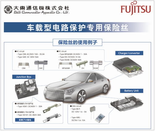 比如新能源汽車興起的今天,汽車動力板塊中的高效率直流馬達(dá)和鋰電池應(yīng)用越來越廣泛,繼續(xù)使用傳統(tǒng)的AC用保險絲已經(jīng)無法可靠地對直流電路進(jìn)行保護(hù),于是DC用保險絲成為了選擇。富士通代理產(chǎn)品線——廣泛應(yīng)用于許多國際大廠如豐田、本田等的Daito旗下各種車載型電路保護(hù)專用保險絲正是覆蓋了這一市場需求,并能以具有競爭優(yōu)勢的成本提供定制化產(chǎn)品。這些車載型電路保險絲主要應(yīng)用在汽車接線盒、充電器/轉(zhuǎn)換器、電池單元等功能板塊中,對于實現(xiàn)系統(tǒng)小型化、高可靠性至關(guān)重要。