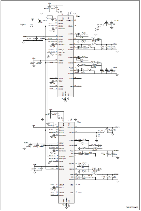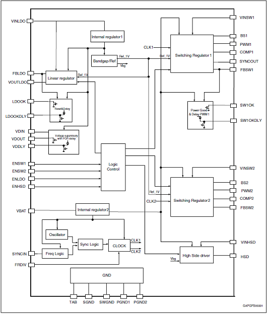 The two DC-DC converters can work in free-run condition or synchronize themselves to an external clock. DC/DCs’PWM outputs have a 180°phase shift.