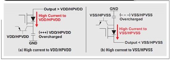 單電源 APA 在正電源(通常稱作 VDD  或 VCC)和基準電壓之間運行。輸出 器件為一些帶主體二極管的 FET,其在正常運行中為反向偏置。如果這些二極 管中的一個變?yōu)檎蚱貌⑶覕y帶過大電流,則正常運行中為反向偏置的主體二 極管(請參見圖 1)就會被損壞。單電源 APA 被強制超出 VDD(或 VCC)以 上 0.3V 或者基準電壓以下 -0.3V 時,出現(xiàn)這種情況。   圖 1  正向偏置主體二極管的電流傳導(dǎo)