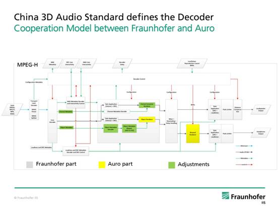 MPEG-H是一組成套的音頻技術,包括編碼、傳輸、解碼,直到終端做聲音還放。即可通過有線電視也可以通過互聯(lián)網(wǎng)傳播。下圖是Fraunhofer IIS與捷成世紀合作模式,為中國3D音頻標準定義的解碼器。