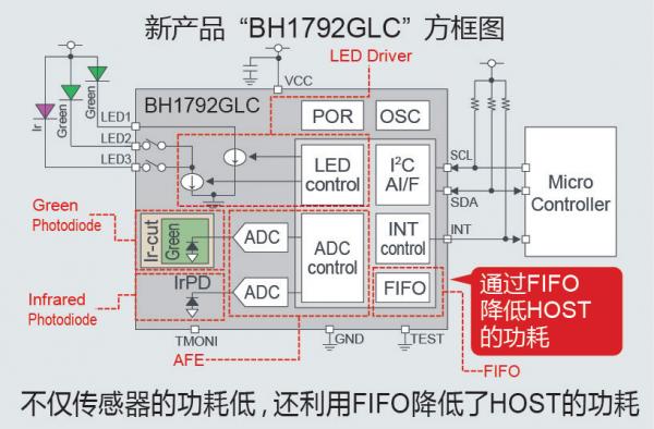 另外,與以往產(chǎn)品相比,新搭載了用來降低HOST(微控制器)端功耗的FIFO(First in First out)功能,通過降低脈搏傳感器和微控制器的功耗,助力應(yīng)用實(shí)現(xiàn)長(zhǎng)時(shí)間驅(qū)動(dòng)。