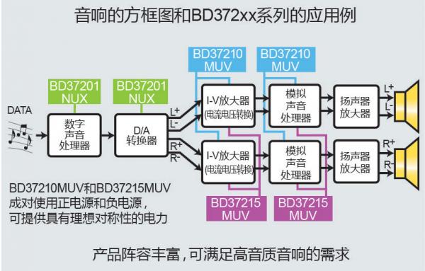 產(chǎn)品陣容包括:非常適用于在低電壓下工作的數(shù)字器件(DA轉(zhuǎn)換器、DSP等)的BD37201NUX、非常適用于在高電壓或正負(fù)兩個(gè)電源下工作的模擬器件(聲音處理器、電流-電壓轉(zhuǎn)換放大器等)的BD37210MUV(正電源)和BD37215MUV(負(fù)電源)。未來還會(huì)在這些產(chǎn)品的基礎(chǔ)上繼續(xù)擴(kuò)充產(chǎn)品陣容,強(qiáng)有力地支持音響設(shè)備的高音質(zhì)化發(fā)展。