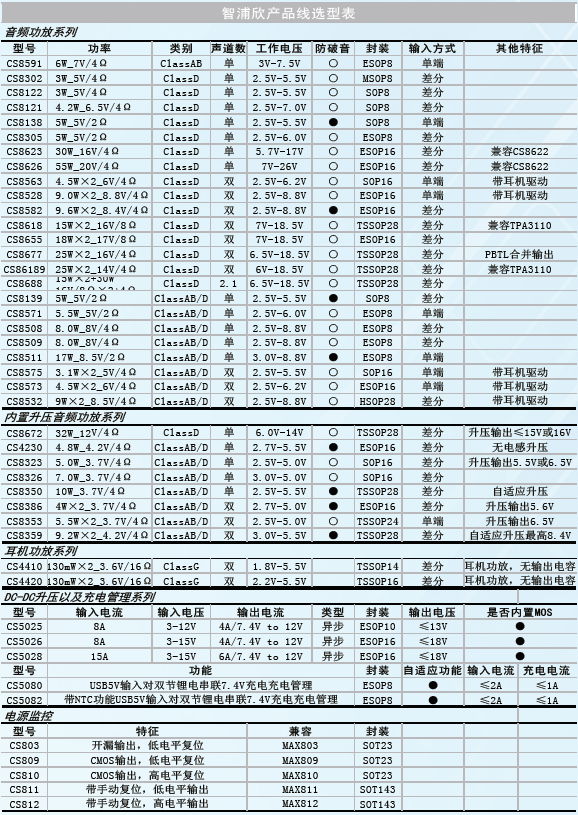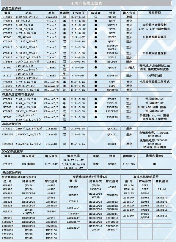 ·I2S數(shù)字功放IC/內(nèi)置DSP音頻算法功放芯片  ·馬達(dá)驅(qū)動IC  ·2.1聲道單芯片D類功放IC  ·內(nèi)置DC/DC升壓模塊的D類功放IC  ·鋰電充電管理IC/快充IC  ·無線遙控方案  ·直流無刷電機(jī)驅(qū)動芯片