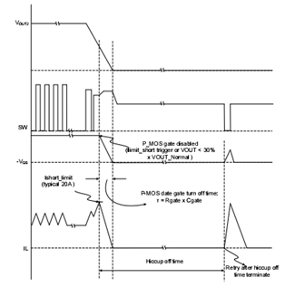 從上圖我們可以看到,所需要的外部器件很少。該芯片還提供一個(gè)單獨(dú)的 pin 腳 DISDRV 來(lái)驅(qū)動(dòng)負(fù)載輸出端的外部 FET(P-FET),在設(shè)備關(guān)斷或者輸出短路時(shí)它能完全斷開(kāi)輸入與輸出的連接。啟動(dòng)時(shí),通過(guò)內(nèi)部 55uA 的吸入電流源來(lái)控制外部 P-FET 開(kāi)關(guān)。同時(shí)具有短路保護(hù)功能,如果電感電流達(dá)到了短路保護(hù)電流限制閾值(典型值 20A),或者輸出電壓降低到了正常輸出值的70%,那么該芯片就會(huì)進(jìn)入間斷(hiccup)模式,關(guān)斷自己然后 90m 后重啟,這樣就能減小熱應(yīng)力。短路狀況消失后,系統(tǒng)會(huì)重啟并且進(jìn)入啟動(dòng)流程:
