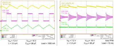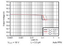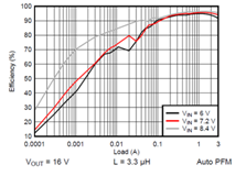 在不同輸入條件下,電感 3.3uH,輸出 16V 時(shí)的不同負(fù)載的效率曲線,最高可達(dá)96%,在自動(dòng) PFM/PWM 切換模式下,輕載效率也高達(dá)90%以上:
