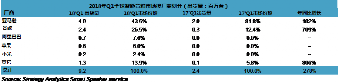 Strategy Analytics總監(jiān)David Watkins評(píng)論道:“2018年Q1亞馬遜和谷歌全球出貨量份額總計(jì)達(dá)到70%,盡管它們的總計(jì)份額與2017年Q4的84%和2017年Q1的94%相比有所下降。部分原因是由于中國(guó)市場(chǎng)的強(qiáng)勁增長(zhǎng),而亞馬遜和谷歌目前仍缺席中國(guó)的智能音箱市場(chǎng)。 阿里巴巴和小米在中國(guó)領(lǐng)先,僅靠中國(guó)國(guó)內(nèi)市場(chǎng)的實(shí)力就足以推動(dòng)它們晉升全球前五。”