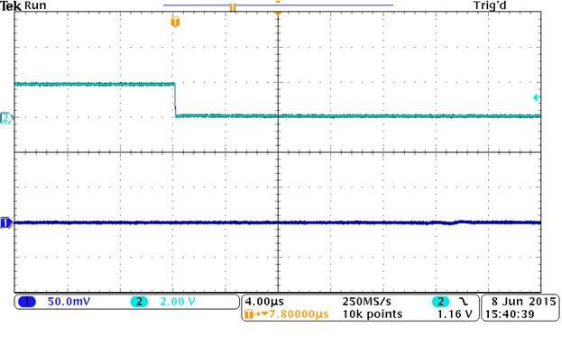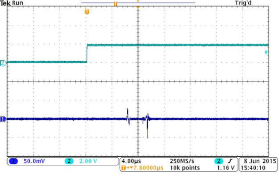 圖3和圖4分別顯示了OPA1622在啟用和禁用期間的性能。只有極小的輸出瞬態(tài)會伴隨啟用或禁用的過程。輸出瞬態(tài)發(fā)生的時間極短,因此使用耳機時聽到的可能性不大。