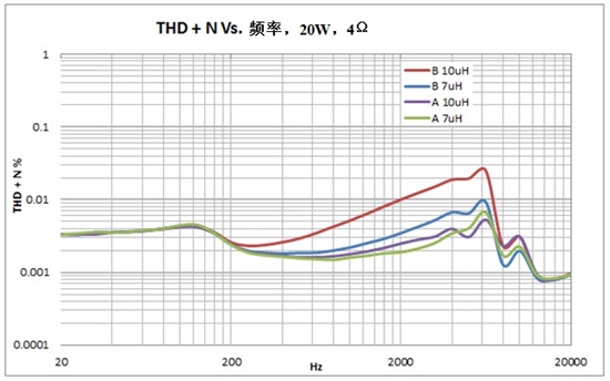 還要注意的是,在20W條件下,總諧波失真與頻率性能顯著改善。若您在可接受較高THD性能的放大器周圍設(shè)計LC濾波器,或者若放大器固有的THD較高,制造商B的10μH電感器可作為一個合適的候選對象。結(jié)束時,系統(tǒng)的設(shè)計者必須在電感器的線性度、成本和尺寸之間做出選擇。