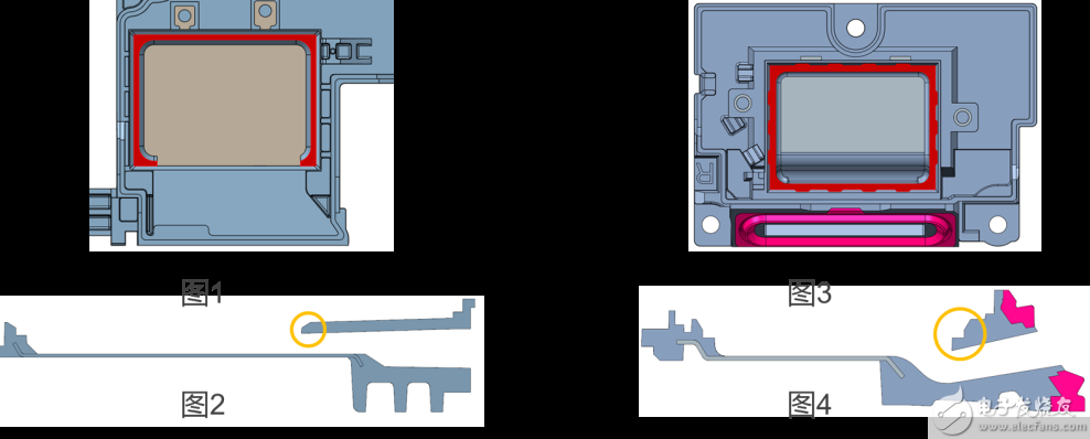 防水BOX需要設(shè)計(jì)四邊臺(tái)階如圖3,普通box設(shè)計(jì)三邊臺(tái)階如圖1,氣壓會(huì)使單體的音膜和盆架分離,造成前后腔串通導(dǎo)致防水失效;截面的差異見(jiàn)圖2和圖4的黃色區(qū)域。