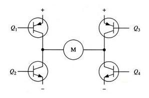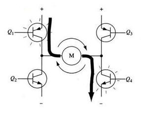 當(dāng)三極管Q1和Q4導(dǎo)通時(shí),電流將從左至右流過(guò)電機(jī),從而驅(qū)動(dòng)電機(jī)按特定方向轉(zhuǎn)動(dòng)(電機(jī)周圍的箭頭指示為順時(shí)針?lè)较?。