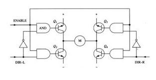基于上述原因,在實(shí)際驅(qū)動(dòng)電路中通常要用硬件電路方便地控制三極管的開(kāi)關(guān)。 圖4所示就是基于這種考慮的改進(jìn)電路,它在基本H橋電路的基礎(chǔ)上增加了4個(gè)與門(mén)和2個(gè)非門(mén)。4個(gè)與門(mén)同一個(gè)“使能”導(dǎo)通信號(hào)相接,這樣,用這一個(gè)信號(hào)就能 控制整個(gè)電路的開(kāi)關(guān)。而2個(gè)非門(mén)通過(guò)提供一種方向輸人,可以保證任何時(shí)候在H橋的同側(cè)腿上都只有一個(gè)三極管能導(dǎo)通。(與前面的示意圖一樣,圖4所示也不是 一個(gè)完整的電路圖,特別是圖中與門(mén)和三極管直接連接是不能正常工作的。)