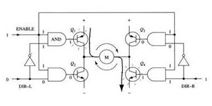 采用以上方法,電機(jī)的運(yùn)轉(zhuǎn)就只需要用三個(gè)信號(hào)控制:兩個(gè)方向信號(hào)和一個(gè)使能信號(hào)。如果DIR-L信號(hào)為0,DIR-R信號(hào)為1,并且使能信號(hào)是1,那么 三極管Q1和Q4導(dǎo)通,電流從左至右流經(jīng)電機(jī)(如圖5所示);如果DIR-L信號(hào)變?yōu)?,而DIR-R信號(hào)變?yōu)?,那么Q2和Q3將導(dǎo)通,電流則反向流過(guò)電機(jī)。