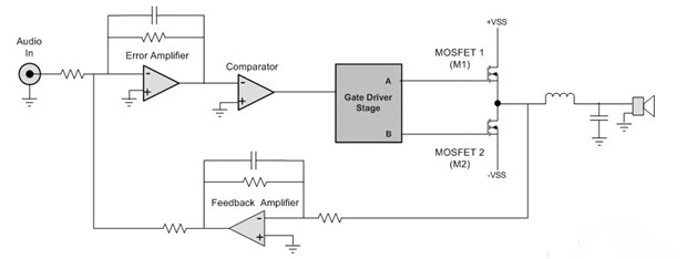 PWM信號(hào)進(jìn)行適當(dāng)?shù)碾娖阶儞Q,然后送到柵極驅(qū)動(dòng)器,這個(gè)驅(qū)動(dòng)器控制由MOSFET(M1和M2)組成的雙態(tài)功率電路。放大后的信號(hào)然后通過輸出濾波器(消除PWM載波頻率),最終僅僅放大了的模擬音頻信號(hào)驅(qū)動(dòng)揚(yáng)聲器。通過把濾波器輸入信號(hào)反饋到錯(cuò)誤放大器輸入端,進(jìn)行外部環(huán)路濾波,降低了失真和噪聲,進(jìn)一步提高了音頻輸出保真度。