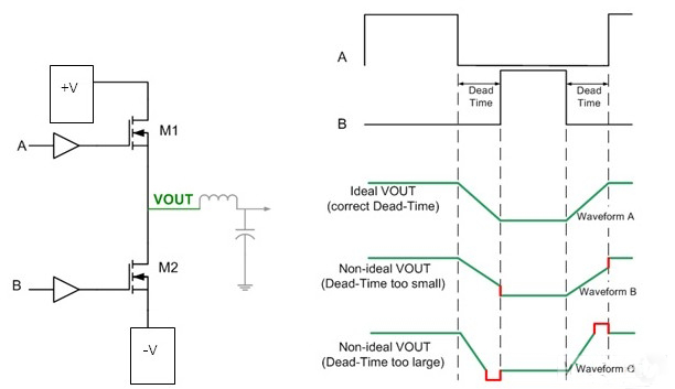 D類放大器死區(qū)時(shí)間(即兩個(gè)開關(guān)均處于關(guān)閉狀態(tài)時(shí)的時(shí)間段)直接影響到效率和THD。過于短暫的死區(qū)時(shí)間會(huì)引起直通電流,降低效率,過長(zhǎng)的死區(qū)時(shí)間又會(huì)增大THD,這會(huì)給音頻保真度帶來不利影響。