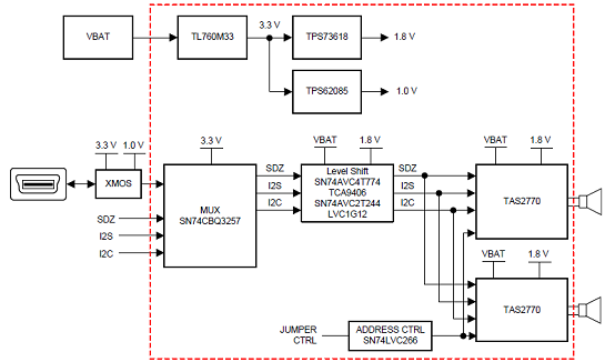 This stereo audio subsystem uses two TAS2770 devices for improved audio capabilities over CODECsolutions. The TAS2770 is highly configurable to various audio input formats and has integrated speakervoltage and current sensing, which can be used to determine the maximum audio signal whilesimultaneously protecting against thermal and mechanical failure mechanisms.