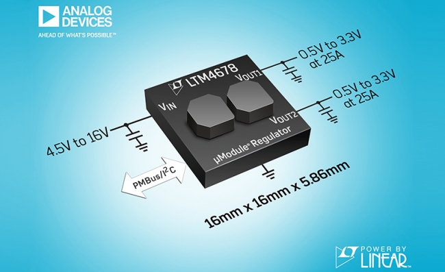 Analog Devices, Inc (ADI) 宣布推出 Power by Linear™ LTM4678,該器件是一款具有 PMBus 數(shù)字接口的雙通道 25A 或單通道 50A 降壓型µModule ® 穩(wěn)壓器。 LTM4678 將兩個(gè)電感器疊置并裸露在 BGA 封裝的頂部以充當(dāng)散熱器,可幫助散發(fā)封裝內(nèi)部的熱量,從而使器件保持低溫 。用戶可利用片內(nèi) EEPROM 和 PMBus I2C 測(cè)量、改變和記錄主要的電源參數(shù),例如電壓、負(fù)載電流、溫度和時(shí)序。5 個(gè) LTM4678 能夠通過均流 (各分擔(dān) 50A) 為處理器、FPGA 和 ASIC 等負(fù)載提供高達(dá) 250A 的電流。主要應(yīng)用包括 PCIe 板、通信基礎(chǔ)設(shè)施、云計(jì)算、光學(xué)以及醫(yī)療、工業(yè)和測(cè)試與測(cè)量設(shè)備。