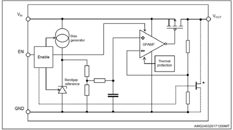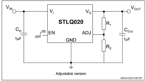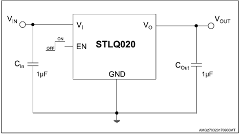 Even though the device intrinsic consumption is ultra-low, STLQ020 is able to provide fast transient response and good PSRR performance, thanks to its adaptive biasing circuit. enable pin puts the STLQ020 in shutdown mode, reducing total current consumption to 1 nA.
