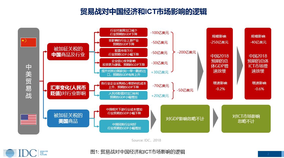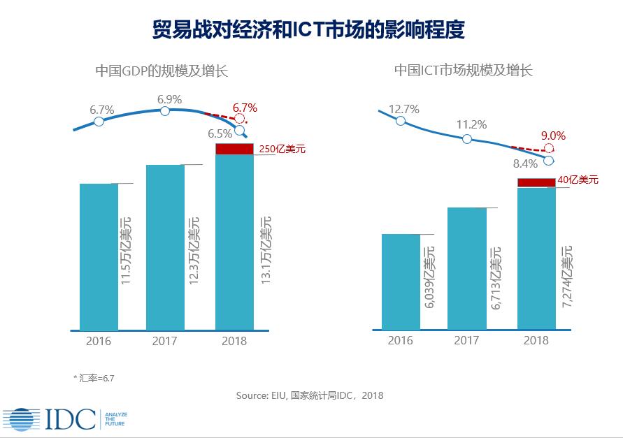 貿(mào)易戰(zhàn)對(duì)中美兩國的經(jīng)濟(jì)都將有負(fù)面影響,特別是對(duì)貿(mào)易順差巨大的中國。根據(jù)IDC的研究,基于當(dāng)前雙方各340億美元產(chǎn)品開始加征關(guān)稅,中國2018年GDP增長率將減少0.2%(原來的6.7% 到影響后的6.5%),影響的GDP總額約250億美元(1US$=6.7 RMB)。中國2018年總體ICT市場增長率將減少0.6%(原來9.0%到影響后的8.4%),影響的ICT市場規(guī)模約40億美元。