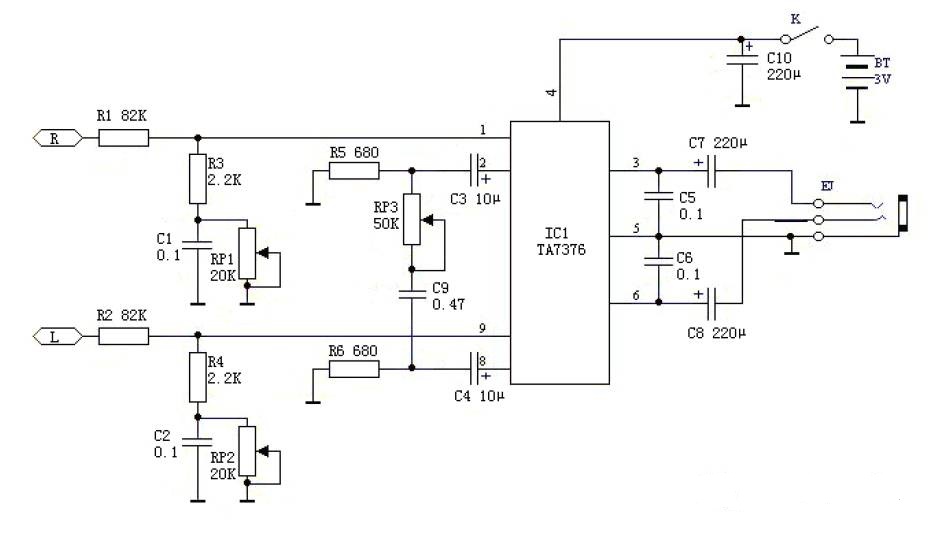 由電阻電容組成的低頻增強電路。利用功率放大器IC的反饋輸入,組成立體聲反相合成電路。利用功率放大器IC組成頭戴耳機的驅(qū)動電路。從輸入端IC之間的電阻電容起到增強低頻特性的作用,因為加有電位器,低頻部分的增強量可在0--10倍之間連續(xù)可調(diào)。立體聲反相合成電路IC 2腳和8腳的直流耦合電容之后,由0.47μF和50K的電位器組成。在此電路中,把立體聲的廣場效果成分中的高音部分左右分別反相后合成,起到增強效果的作用。用東芝TA7376P推動頭戴式耳機。這種IC內(nèi)藏兩個通道,外接元件少,可在低電壓下工作。負載阻抗較低時,可重放出動人效果的低頻聲音 。電源若改用5#電池,用四只串聯(lián),電壓為6V,可直接驅(qū)動高輸出的揚聲器。若將三個200μF/10V的電容增加到1000μF左右,可獲得更好的效果。