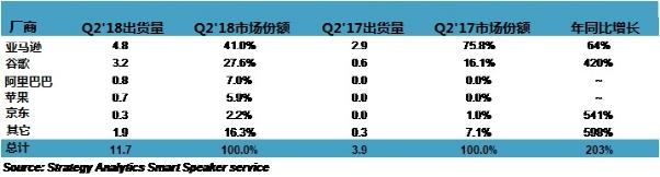 Strategy Analytics總監(jiān)David Watkins表示,“亞馬遜和谷歌全球智能音箱出貨量份額從2017年Q2的超過90%下降到2018年Q2的69%。此次下降不僅反映了智能音箱市場競爭的加劇同時也反映了亞馬遜和谷歌無法打入快速增長的中國市場——該市場由阿里巴巴,京東和百度等本土大牌主導(dǎo)。 中國有潛力成為智能音箱以及支持它們的語音助理平臺的巨大盈利市場;同時,谷歌最近以5億美元投資了中國電子商務(wù)巨頭京東,并與其達成了戰(zhàn)略合作伙伴關(guān)系,這表明抓住中國市場帶來的機遇將會至關(guān)重要!