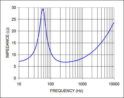 另外還需要注意音頻帶寬內(nèi)負(fù)載阻抗的變化。揚(yáng)聲器是一個(gè)復(fù)雜的機(jī)電系統(tǒng),具有多種諧振元件。換言之,8Ω的揚(yáng)聲器只在很窄的頻帶內(nèi)才呈現(xiàn)出8Ω阻抗。在大部分音頻帶寬內(nèi),阻抗都會(huì)大于其標(biāo)稱值,如圖6示。在大部分音頻帶寬內(nèi),該揚(yáng)聲器的阻抗都會(huì)遠(yuǎn)大于其8Ω的標(biāo)稱值。然而,高頻揚(yáng)聲器和分頻網(wǎng)絡(luò)的存在將降低阻抗值。因此必須考慮系統(tǒng)的總阻抗以確保足夠的電流驅(qū)動(dòng)能力和散熱性能。