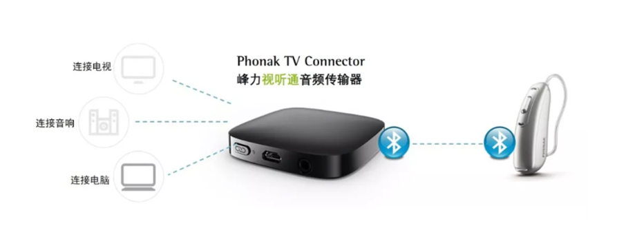 神通系列助聽器可以與視聽通音頻傳輸器 (Phonak TV Connector) 實現(xiàn)藍(lán)牙配對,將高清優(yōu)質(zhì)的音頻從電視機(jī)或者立體聲音響上,直接無線傳輸?shù)街犉,使用者可以與家人朋友一起收聽,不必?fù)?dān)心音量過大影響他人。視聽通音頻傳輸器搭載 AirStream 技術(shù),傳輸無延遲、更清晰,同時支持立體聲音頻輸出。