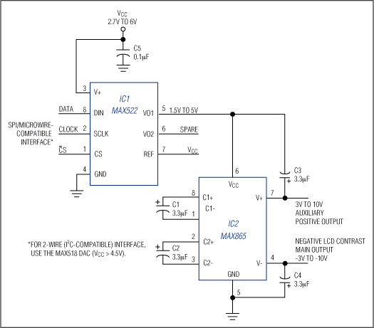 圖1. 該可調(diào)負(fù)壓由8位、串行輸入DAC控制的反相倍壓型電荷泵構(gòu)成