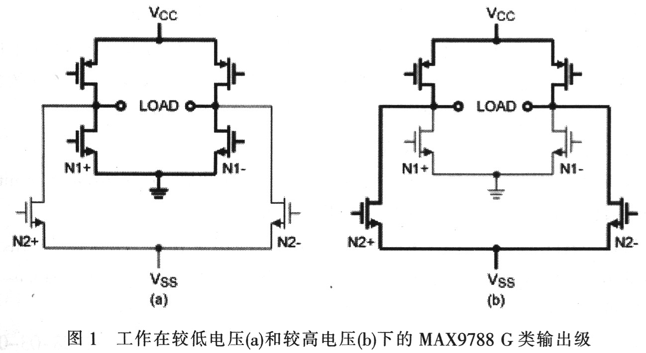 G類放大器MAX9730和MAX9788則以獨特的方式利用G類技術(shù),它們由電荷泵產(chǎn)生負(fù)壓,而非高、低正電源。當(dāng)放大器產(chǎn)生較小的輸出信號時,放大器由電池電壓和地作為供電電源。這種模式下,器件的工作方式與常見的5 V AB類放大器(圖1a)類似。當(dāng)輸出信號超出電源電壓時,放大器選擇電池電壓和負(fù)電荷泵輸出供電(圖1b)。由此,G類放大器的輸出信號遠(yuǎn)遠(yuǎn)高于傳統(tǒng)放大器的信號。