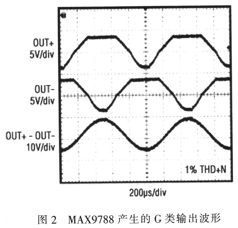 MAX9730和MAX9788可以確保在兩電源之間切換不會產(chǎn)生音頻雜音。當(dāng)輸出信號達(dá)到VCC和GND供電所允許的極限時,負(fù)電源被自動連接至輸出級。這樣,輸出信號不會在負(fù)擺幅側(cè)出現(xiàn)削頂,仍箝位于其正擺幅。為了校正這一點,放大器給負(fù)極性輸出增加額外的校正信號,如圖2所示。分別觀察正、負(fù)輸出時,正半周波形被明顯削頂,而負(fù)半周存在明顯失真。盡管這些信號出現(xiàn)了嚴(yán)重的失真,但卻被嚴(yán)格控制,充分利用了該架構(gòu)的優(yōu)勢。施加到負(fù)載上的實際輸出信號沒有失真。