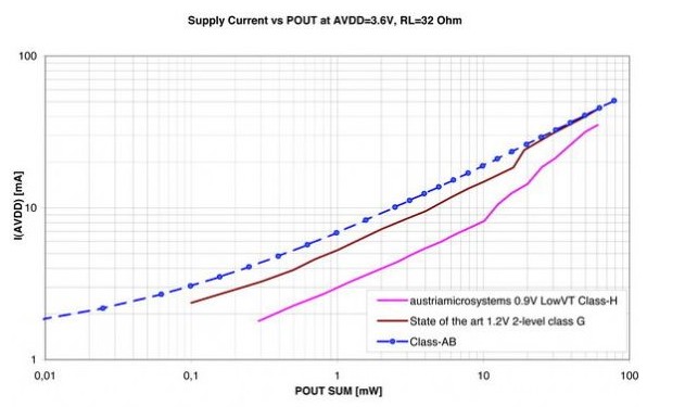這正是奧地利微電子特殊的LowVT CMOS工藝的承諾。這些工藝已用于生產(chǎn)全新的AS3561器件。AS3561是一個H類放大器,可為耳機放大器提供低至±0.9 V的電源電壓。搭配高效率DC-DC轉(zhuǎn)換器及自適應(yīng)式電荷泵,它可將功耗降至最低:2 x 0.1mW播放的電池電壓為3.6V,典型電流消耗僅有1.7mA。這種高效率架構(gòu)與G類及AB類架構(gòu)之間的功耗差異見圖4。
