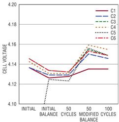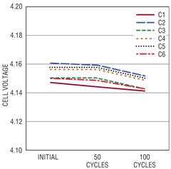 電池組 1 經(jīng)過(guò)了 100 個(gè)充電 / 放電周期,圖 3 顯示若干周期后記錄 6 節(jié)電池的電壓。該圖顯示,經(jīng)過(guò)短暫停頓后,在一個(gè)完整的充電周期結(jié)束時(shí)所測(cè)得的電池電壓。充電后,電池電壓之間的不平衡與容量和內(nèi)部電阻的小量變化有關(guān)。在第一個(gè)完整的周期中,測(cè)得的電池組容量為 2.072AHr,經(jīng)過(guò) 100 個(gè)周期后,所測(cè)得的容量為 2.043AHr,隨著周期數(shù)增加,容量有少量下降。還有一種趨勢(shì),即隨著充電 / 放電周期數(shù)的增加,充電后電池的最終電壓下降了,100 個(gè)周期以后,這種趨勢(shì)尤其顯著。這種趨勢(shì)最有可能是因?yàn)殡姵乩匣痣姵貎?nèi)部電阻的小量增加導(dǎo)致的。內(nèi)部電阻增加使電池更快地達(dá)到充電結(jié)束門(mén)限。盡管在工作時(shí)沒(méi)有平衡,這個(gè)電池組在 100 個(gè)周期中自始至終保持著同樣程度的不平衡。能像這個(gè)電池組一樣,每節(jié)電池自然而然相互匹配的電池組相當(dāng)罕見(jiàn)。