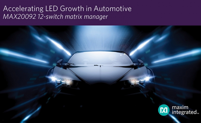 Maxim Integrated Products, Inc (NASDAQ: MXIM)宣布推出MAX20092 12通道開關(guān)矩陣管理器,使得高性能LED陣列車燈和自適應(yīng)光束調(diào)節(jié)設(shè)計(jì)能夠滿足更高電流的設(shè)備需求,同時(shí)降低方案尺寸、提高靈活性。通過最低導(dǎo)通電阻(RDS_ON)的內(nèi)部開關(guān),該IC可最大程度減少LED陣列照明的發(fā)熱,相比最接近的競爭方案降低65%。