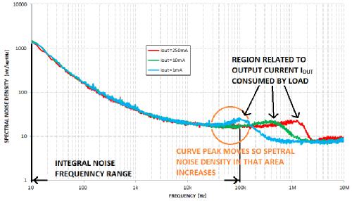 但是,如何表示LDO輸出的噪聲有多大呢?可用如上文所示的積分噪聲頻率范圍表示。這個(gè)范圍通常是10赫茲至100千赫。