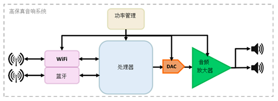 電源管理模塊為Wi-Fi®揚(yáng)聲器電路提供正確的功率電平。假設(shè)應(yīng)用由系統(tǒng)供電(而非電池供電),并且取決于輸出功率,電源不僅需要提供滿足系統(tǒng)功率要求所需的電壓和電流;它還需要提供干凈穩(wěn)定的電源軌,以防止任何電源噪聲進(jìn)入音頻系統(tǒng)并降低音頻質(zhì)量。