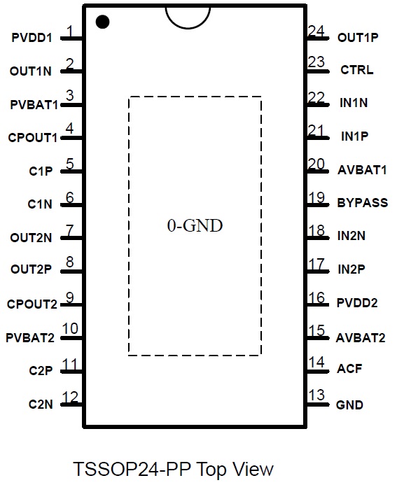 2*2.7W (VBAT=3.3V, RL=4Ω, THD+N=10%)