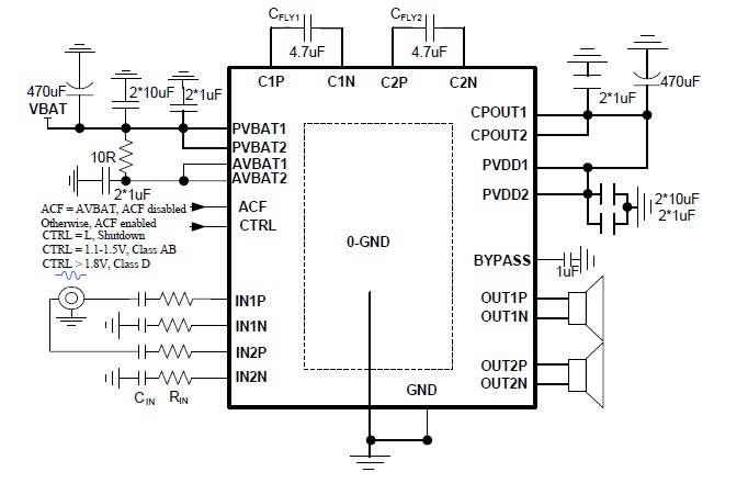 HT8320的最大特點(diǎn)是防削頂失真(ACF)輸出控制功能,可檢測并抑制由于輸入音樂、語音信號幅度過大所引起的輸出信號削頂失真(破音),也能自適應(yīng)地防止在升壓電壓下降所造成的輸出削頂,顯著提高音質(zhì),創(chuàng)造非常舒適的聽音享受,并保護(hù)揚(yáng)聲器免受過載損壞。其具有4種不同的ACF模式,可針對不同應(yīng)用場合。同時(shí)芯片還具ACF-Off 模式。