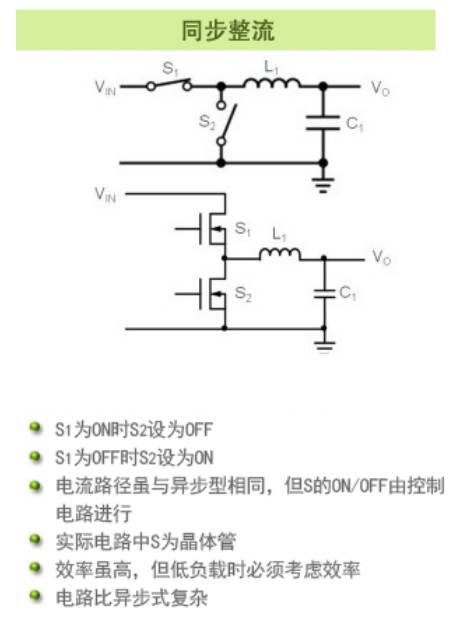其后,筆記本電腦等電池驅(qū)動(dòng)且需要較大功率的應(yīng)用開始要求更高效率,于是可獲得高效率的同步整流式開關(guān)穩(wěn)壓器用IC被陸續(xù)開發(fā),控制或電路極為復(fù)雜的同步整流式變得容易設(shè)計(jì),逐漸成為主流。同步整流式最大可以獲得近95%的效率。