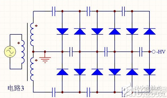 這三個(gè)電路都是6倍電壓泵電路,各有特點(diǎn)。我們通常稱每2倍為一階,用N表示,上述電路都是3階,即N=3。如果希望輸出電壓極性不同,只要將所有的二極管反向就可以了。