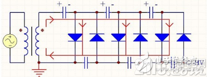 當(dāng)變壓器次級(jí)輸出為上正下負(fù)時(shí),電流流向如圖所示。變壓器向上臂三個(gè)電容充電儲(chǔ)能。