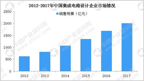 2017年,我國集成電路設(shè)計行業(yè)銷售支出為2074億元,比2016年的添加430億元,增長率為26%,占集成電路行業(yè)的比重由2016年的37.9%提升至38.3%,持續(xù)堅(jiān)持高速增長,在集成電路各細(xì)分行業(yè)中占比最高。