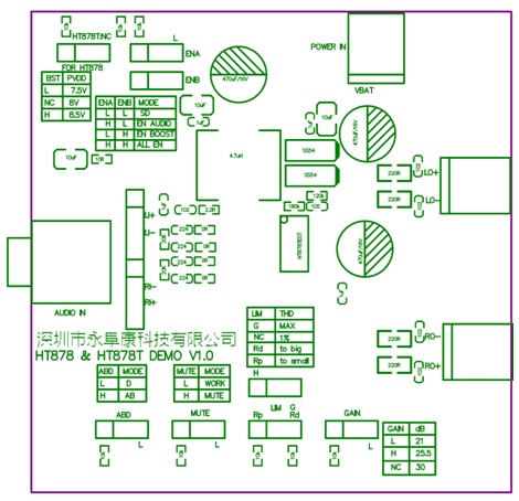 | HT878/HT878T 單節(jié)鋰電池內(nèi)置自適應(yīng)升壓AB/D類切換8W雙聲道音頻功放解決方案 |