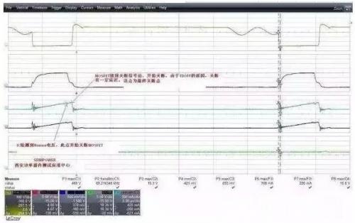 從圖中可以看出,電流波形在快到電流尖峰時(shí),有個(gè)下跌,這個(gè)下跌點(diǎn)后又有一段的上升時(shí)間,這段時(shí)間其本質(zhì)就是IC在檢測(cè)到過流信號(hào)執(zhí)行關(guān)斷后,MOSFET本身也開始執(zhí)行關(guān)斷,但是由于器件本身的關(guān)斷延遲,因此電流會(huì)有個(gè)二次上升平臺(tái),如果二次上升平臺(tái)過大,那么在變壓器余量設(shè)計(jì)不足時(shí),就極有可能產(chǎn)生磁飽和的一個(gè)電流沖擊或者電流超器件規(guī)格的一個(gè)失效。