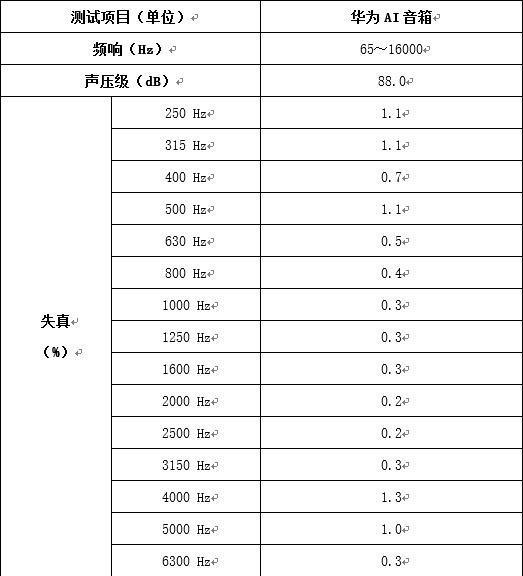 依據(jù)GB/T 12060.5-2011《聲系統(tǒng)設(shè)備 第5部分:揚(yáng)聲器主要性能測(cè)試方法》標(biāo)準(zhǔn),在尖劈全消音室對(duì)華為AI音箱產(chǎn)品進(jìn)行客觀頻響測(cè)試、最大聲壓級(jí)測(cè)試和失真測(cè)試。測(cè)試結(jié)果如下: