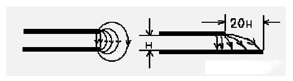 解決的辦法是將電源層內(nèi)縮, 使得電場(chǎng)只在接地層的范圍內(nèi)傳導(dǎo)。 以一個(gè)H(電源和地之間的介質(zhì)厚度)為單位,若內(nèi)縮20H則可以將70%的電場(chǎng)限制在接地層邊沿內(nèi);內(nèi)縮100H則可以將98%的電場(chǎng)限制在內(nèi)。