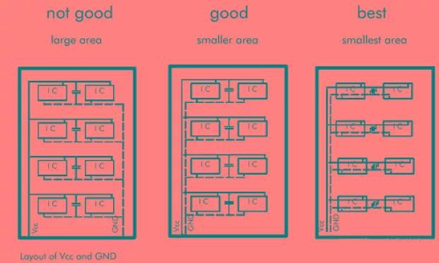 去偶電容的布局要盡量靠近IC的電源管腳,并使之與電源和地之間形成的回路最短。