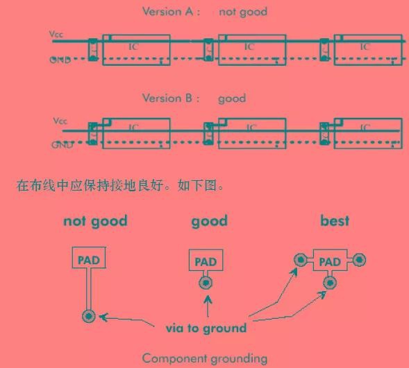 為了防止電源線較長(zhǎng)時(shí),電源線上的耦合雜訊直接進(jìn)入負(fù)載器件,應(yīng)在進(jìn)入每個(gè)器件之前,先對(duì)電源去藕。且為了防止它們彼此間的相互干擾,對(duì)每個(gè)負(fù)載的電源獨(dú)立去藕,并做到先濾波再進(jìn)入負(fù)載。