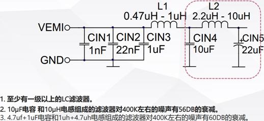 所有的LC濾波器都是以電感結(jié)束,并且要遠離DCDC的高頻環(huán)路。防止電流環(huán)路的近場磁場效應(yīng)對輸入濾波器的影響。